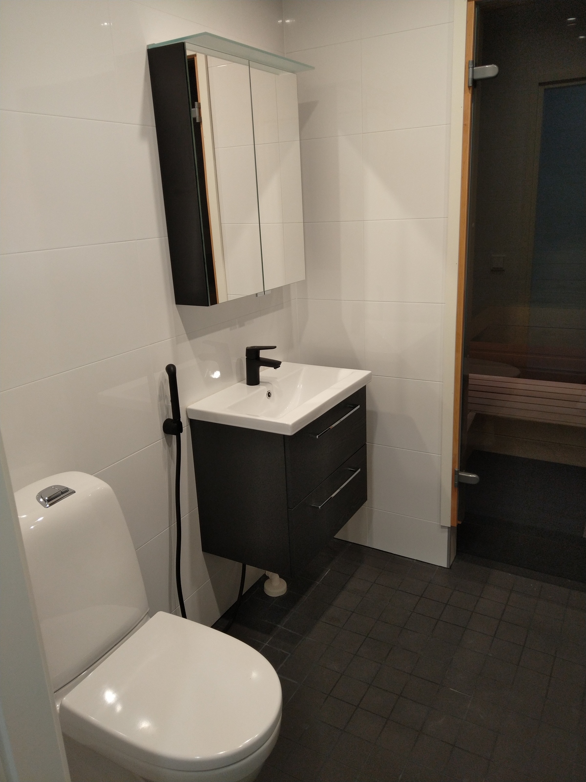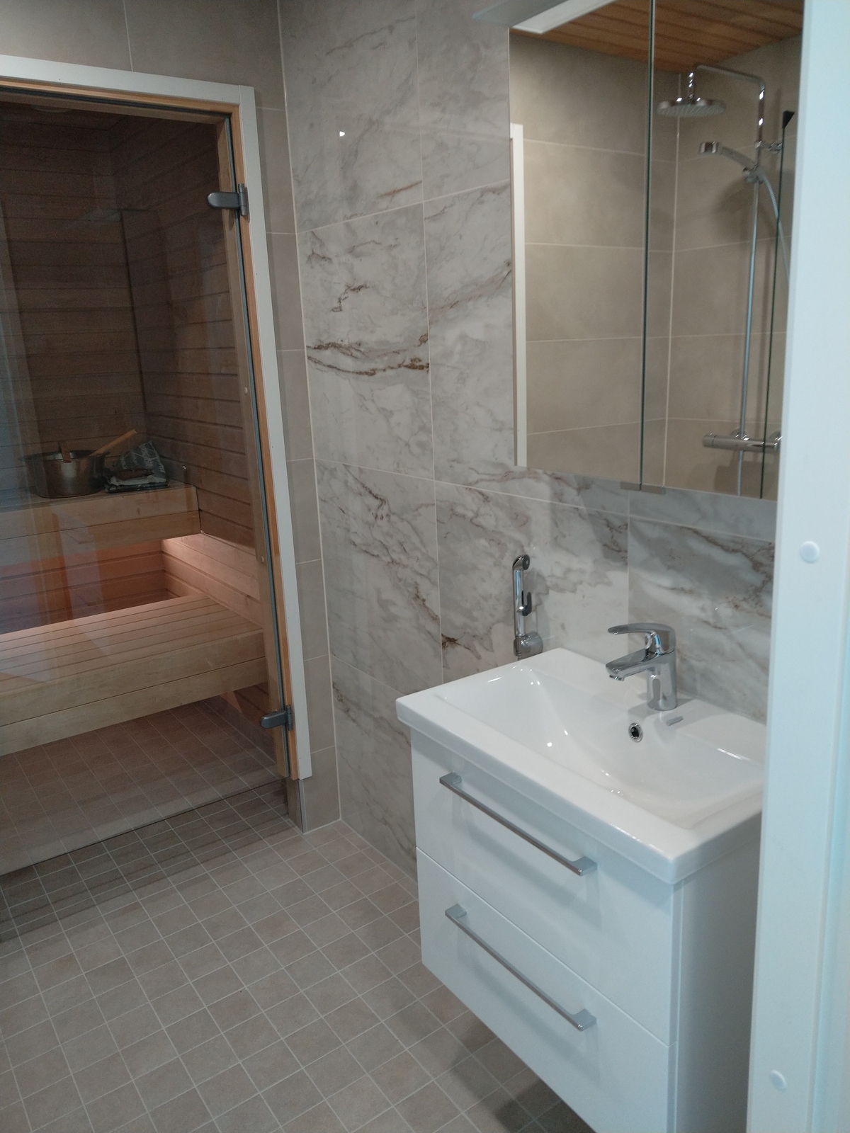 Teimme täydellisen sisäremontin omakotitaloon Espooseen vuonna 2017. Kph, sauna, Wc, keittiö ja lattiat